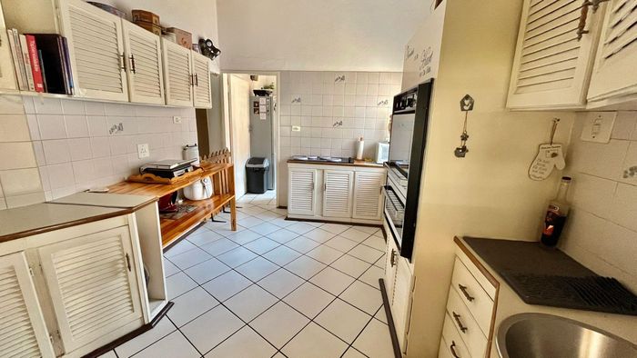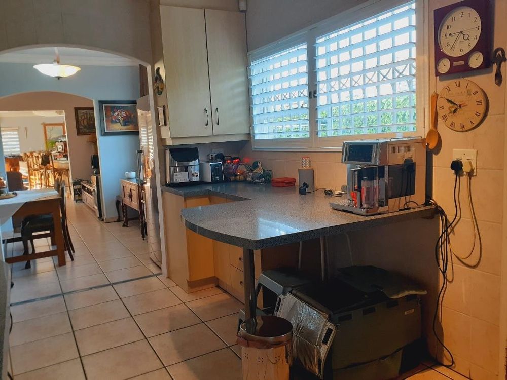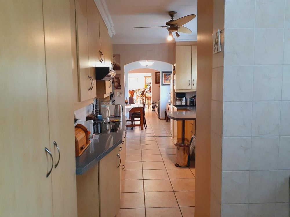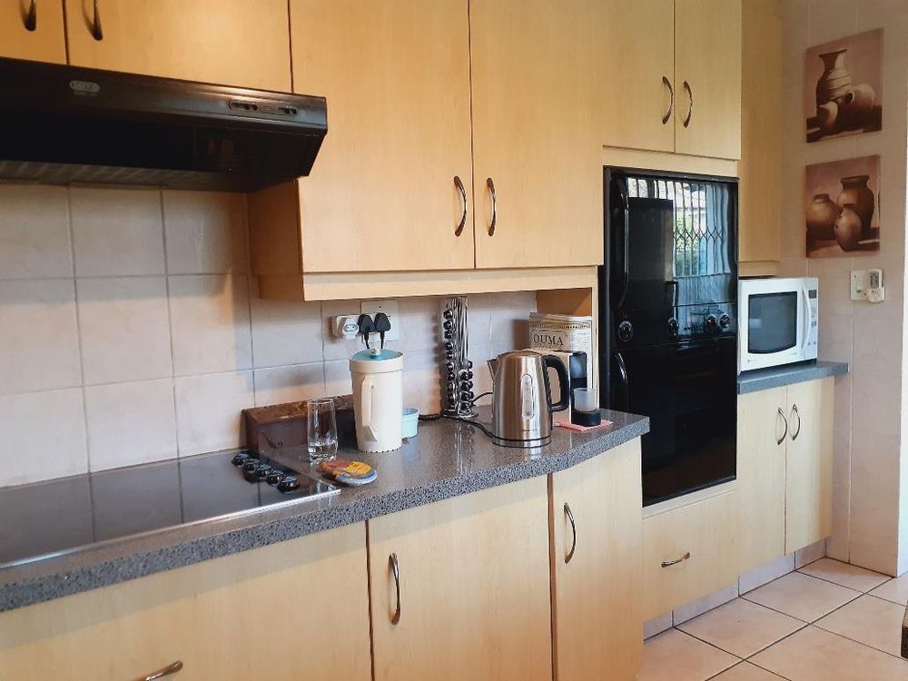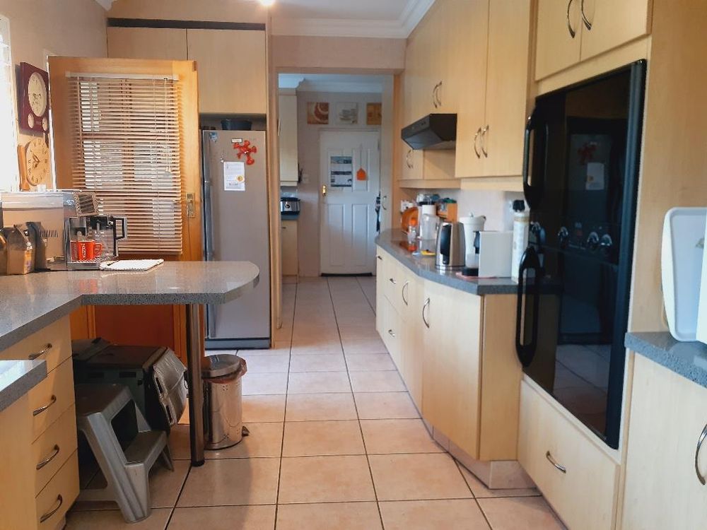 The kitchen is well-sized and features melamine units with elegant granite countertops. A double eye-level oven enhances the cooking experience, while a separate scullery with a double sink and pantry cupboard adds further convenience.