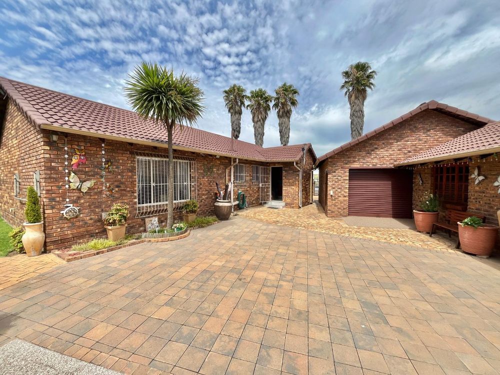 The main house is constructed with durable face bricks and features a pitched tiled roof. Enclosed by 1.8-meter walls for added privacy, the property boasts a small tiled entrance leading to an open-plan lounge, dining room, and kitchen area, all featuring tiled floors. The lounge's bay window allows natural light to flood the space, creating a warm and inviting ambiance.